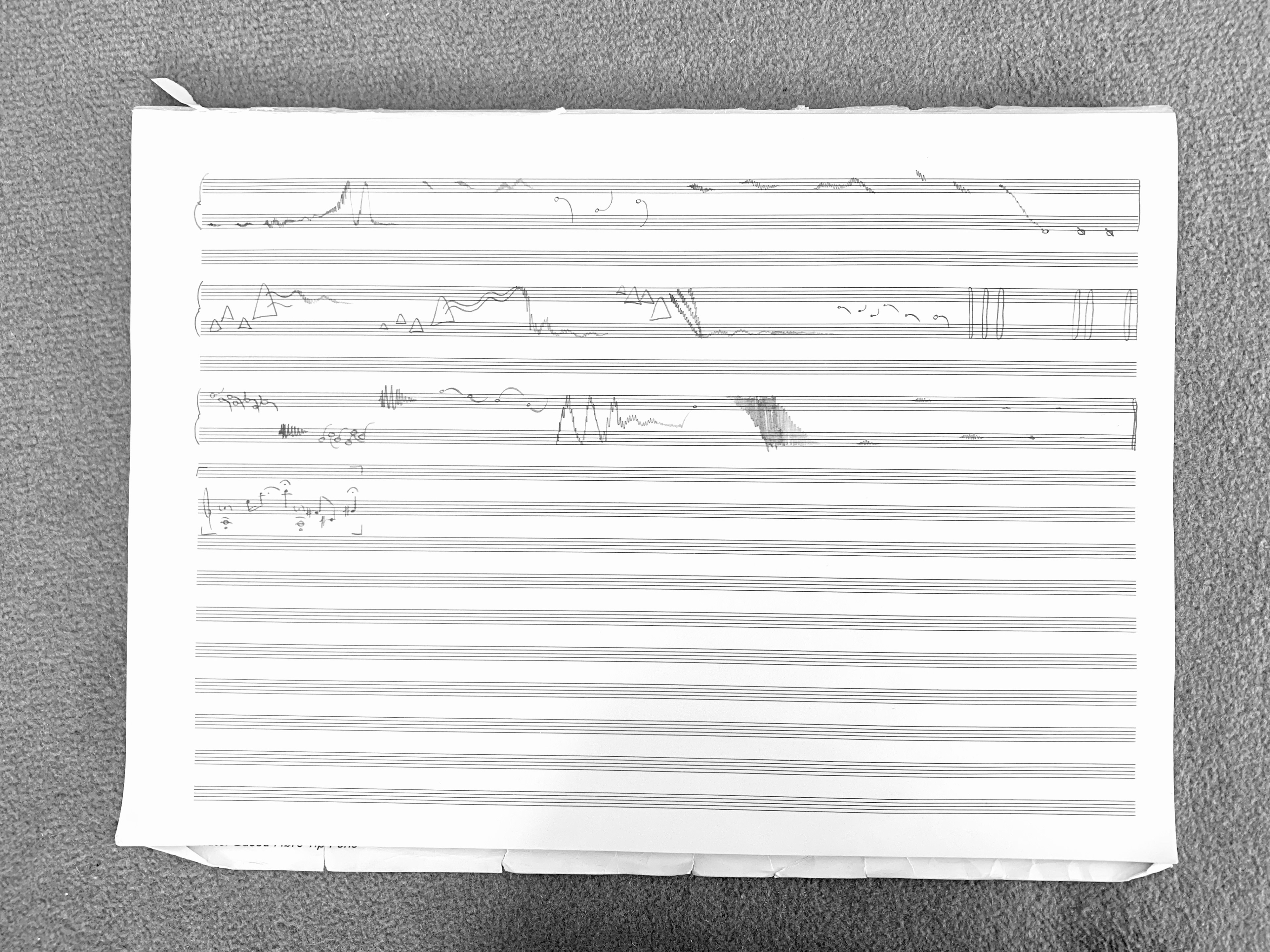 For me, this was the perfect opportunity to try something new. Since I started in education, I’ve never had more than a few weeks to write a piece, so my process became very streamlined. I could quickly whip up a piece in Sibelius and know roughly how it would sound with the help of software instruments. Yet the resultant works all sounded similar… the quick turnarounds required me to use compositional shortcuts which were technically well written, but artistically thin.This new work for guitar seemed like the perfect chance to try something new: improvising and sketching over the course of a few months. I grabbed a guitar (thanks Jasper!) and started to find new sounds. When I discovered something I liked, I drew it in graphic notation on big blank pieces of A3 paper. The composition process quickly developed into something exciting and exhilarating — I never knew what would happen next.